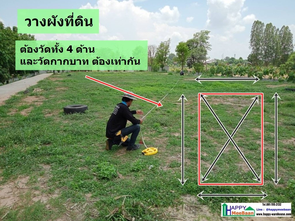 แต่หลังจากวางผังแล้ว สิ่งสำคัญคือ การวัด ระยะทั้ง 4 ด้าน และการวังมุมทแยง ด้องเท่ากัน
