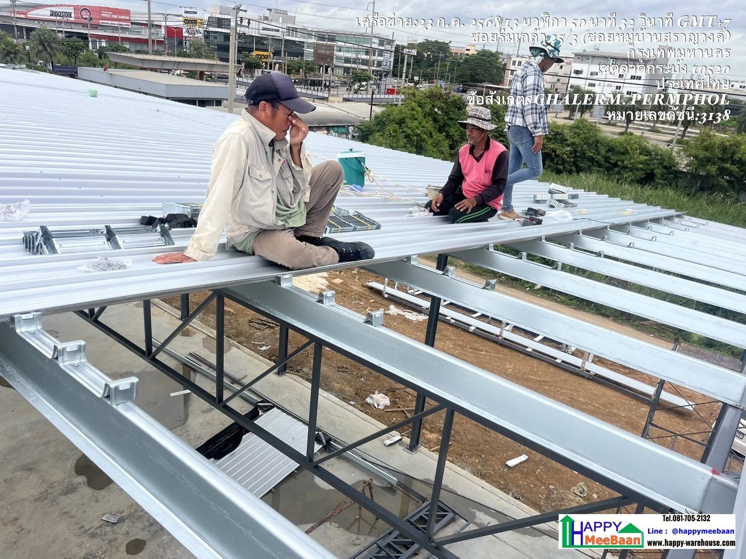 เมื่อดำเนินการติดตั้งโครงสร้างหลักเสร็จ ก็จะติดตั้งแปหลังคา หลังคาเมทัลชีทระบบคลิปล็อค
