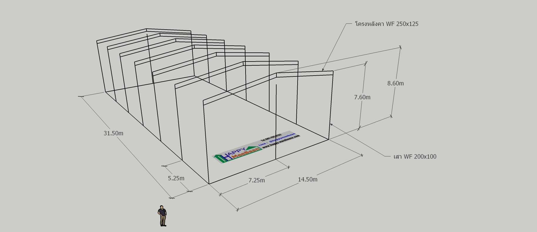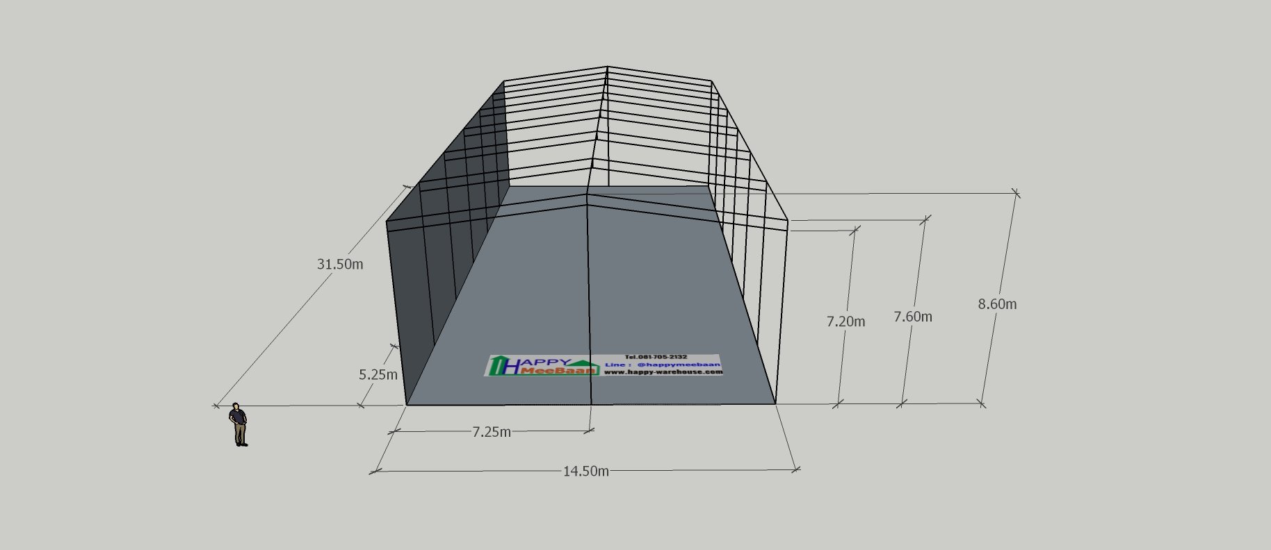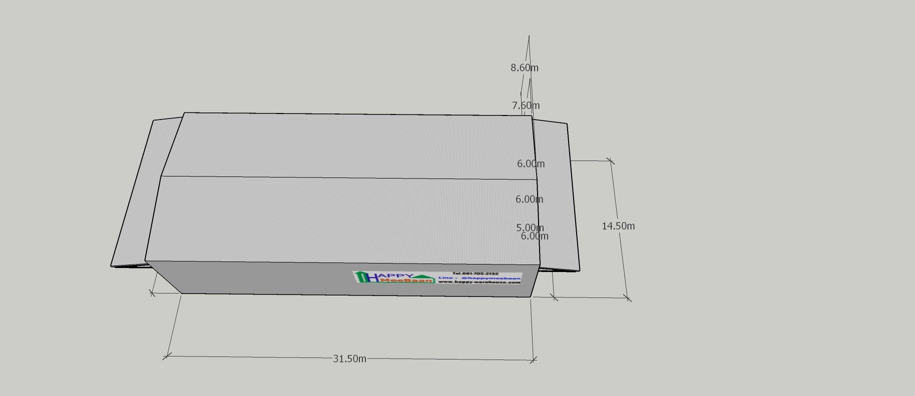 ขนาดโกดัง โครงสร้าง HWH 14.5x31.5 ม. สูง 7.6 เมตร ทรงจั่ว หัวเสา 7.2 เมตร