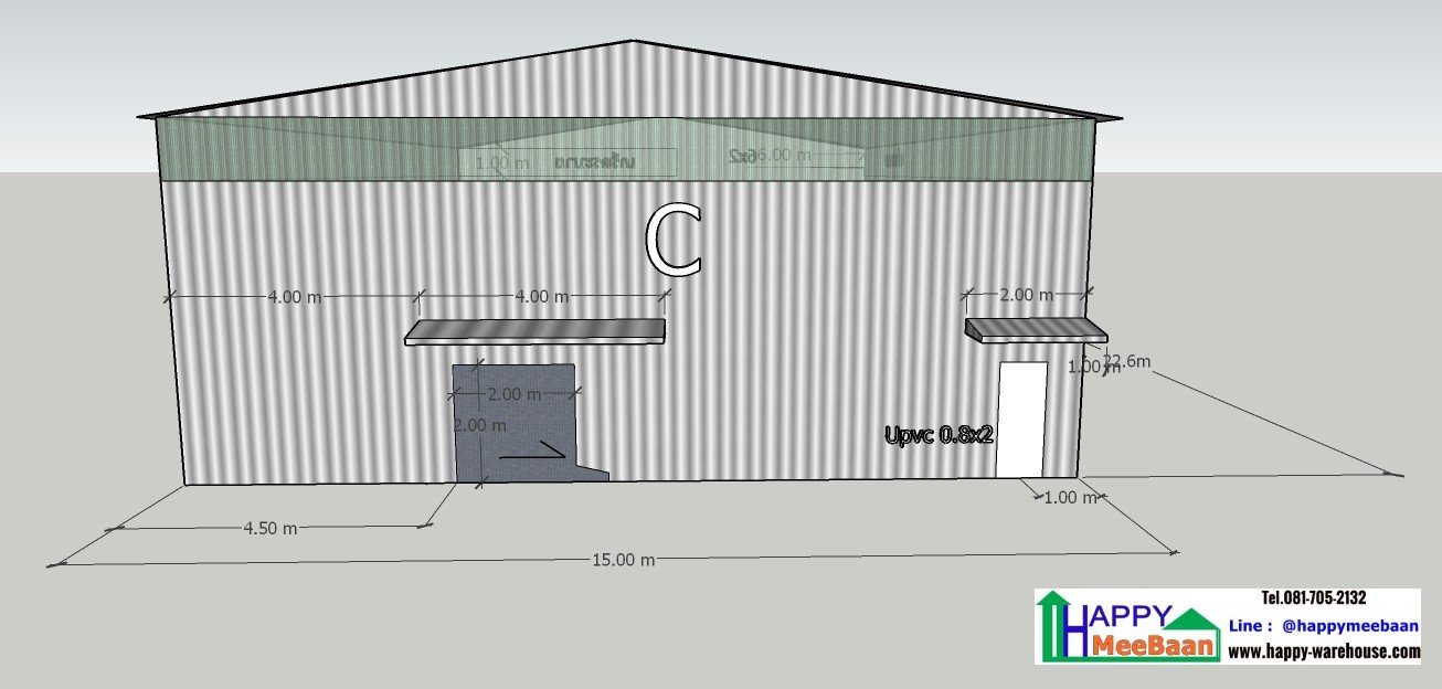 ขนาดโกดัง กว้าง 15 เมตร ยาว 22 เมตร ทรงจั่ว ด้านข้างสูง 6 เมตร