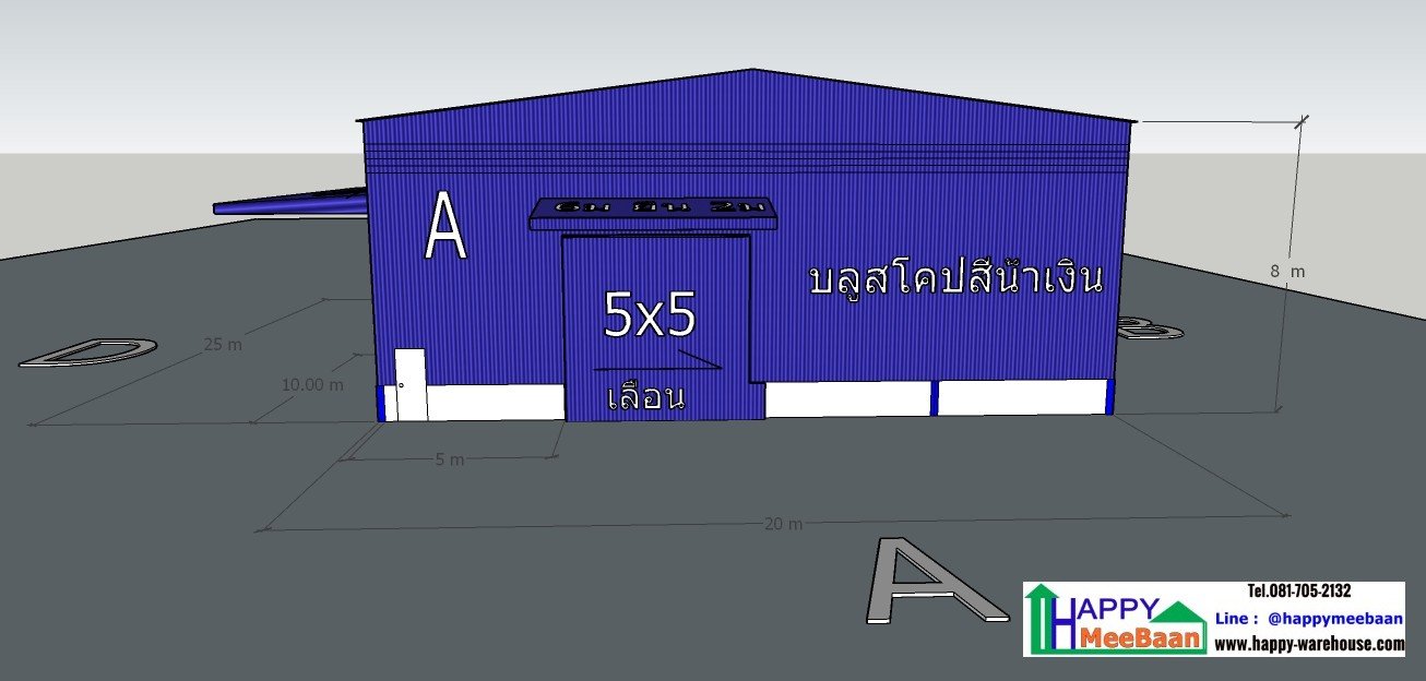 ขนาดโกดัง โครงสร้าง WH-H 20x25 ม. สูง 8 เมตร ทรงจั่วสเปค