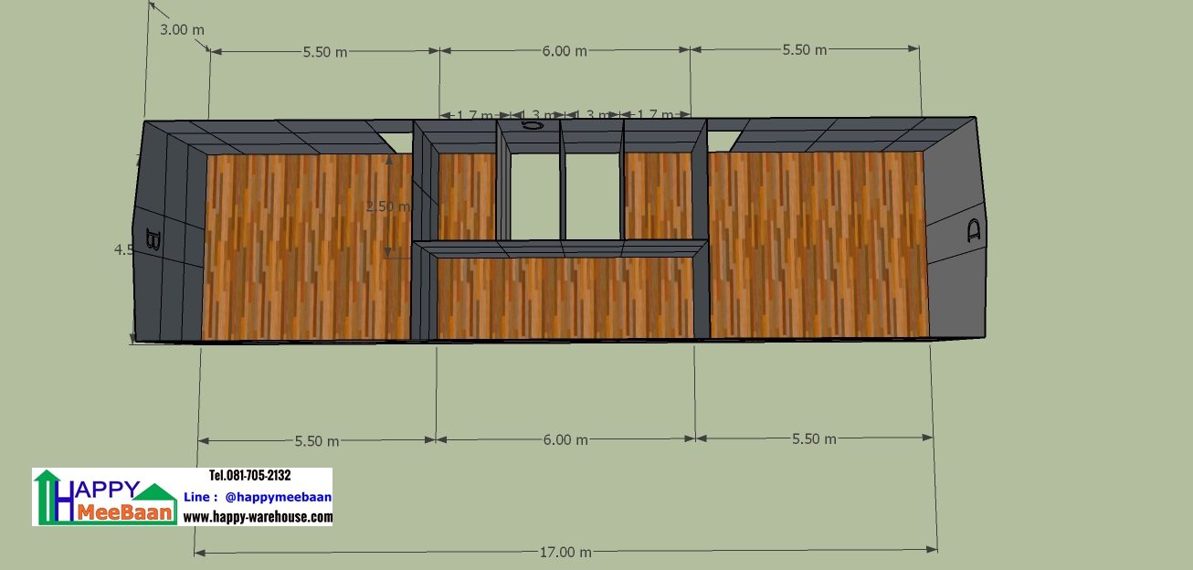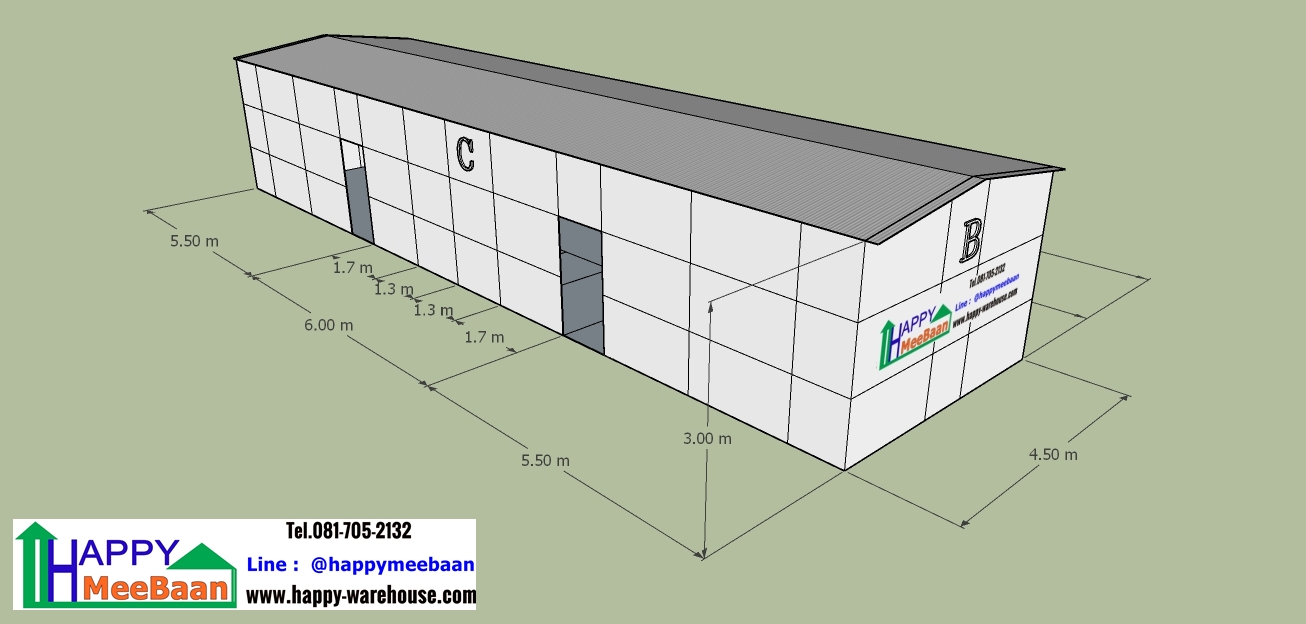 Size: 4.5 x 17 m, Height 3 m (gable roof)