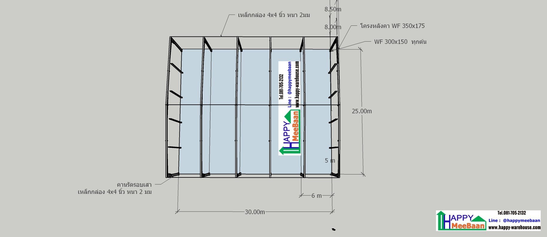 Size: 25 x 30 x 8.5 meters, gable roof, column head height 8 meters